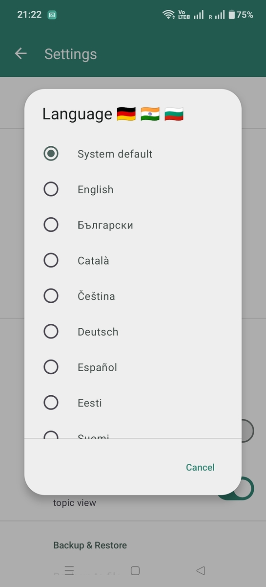 The Android app supports many languages and uses the system language by default. If you'd like to use the app in a different language than your system, you can override it in Settings → General → Language.